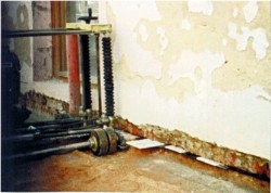 Dauerhafte Abhilfe kann hier der nachträgliche Einbau einer Sperrbahn in die Mauer schaffen. Eine bereits vielfach praktizierte Methode besteht darin, das von Feuchtigkeit befallene Mauerwerk in seiner gesamten Mauerdicke mit Spezialmaschinen horizontal zu durchsägen und nachträglich mit einer Sperrschicht zu versehen.